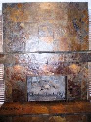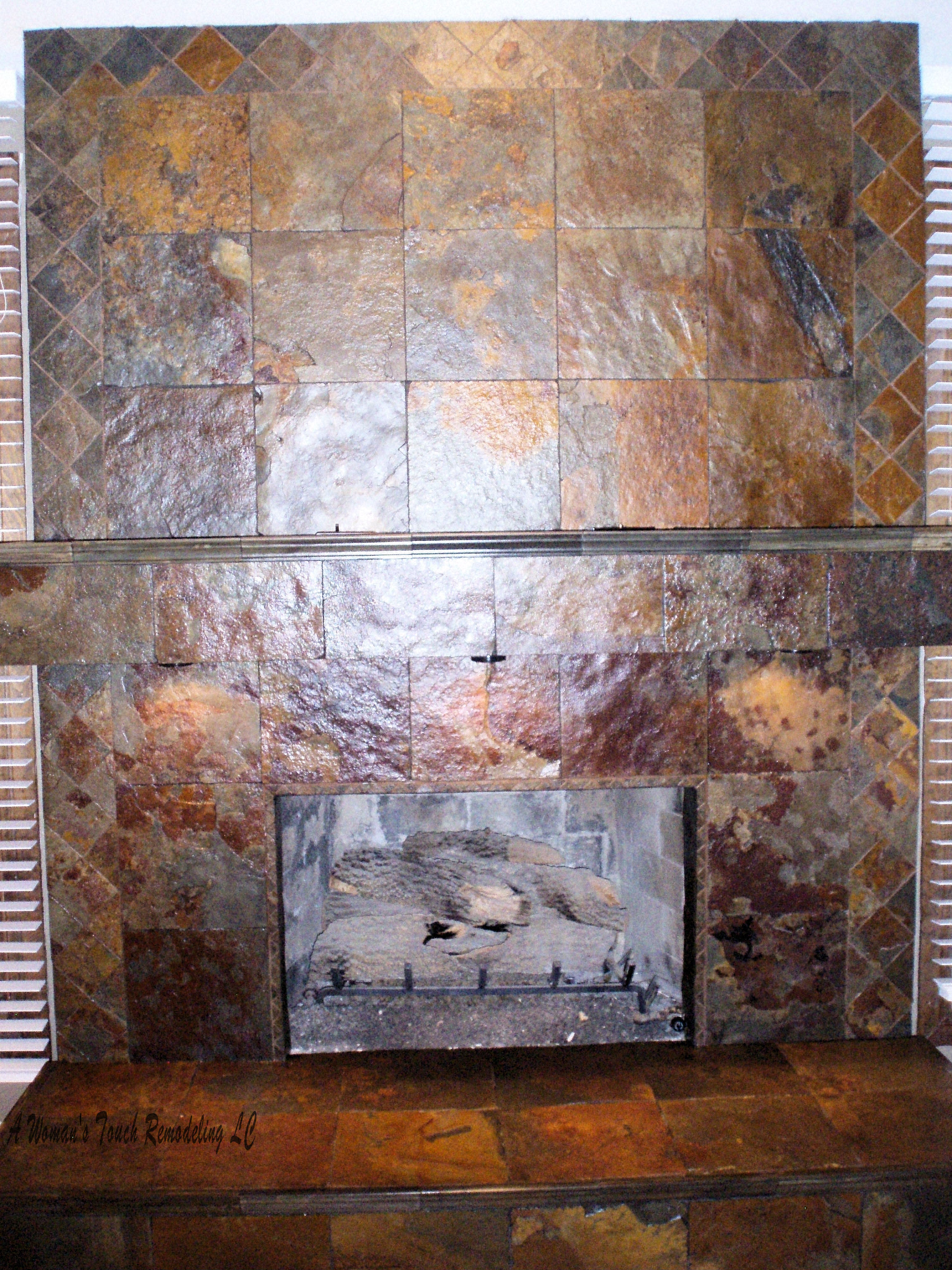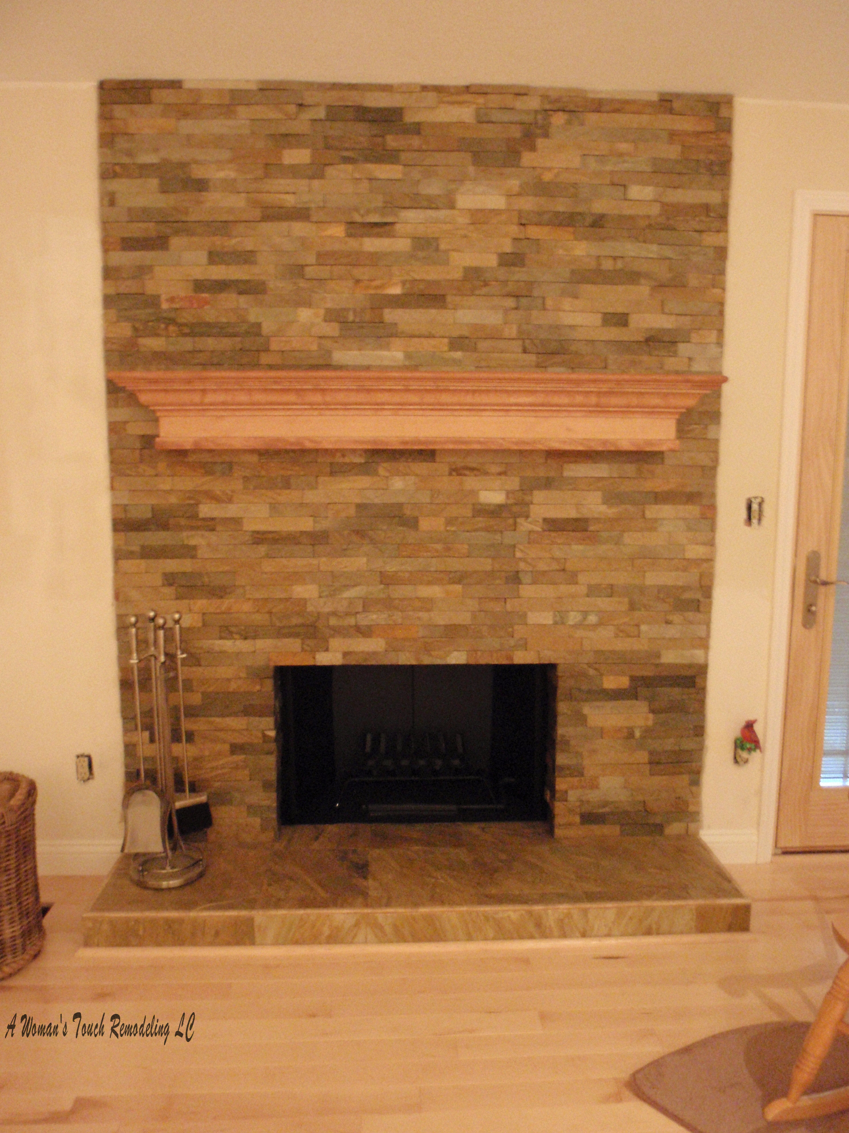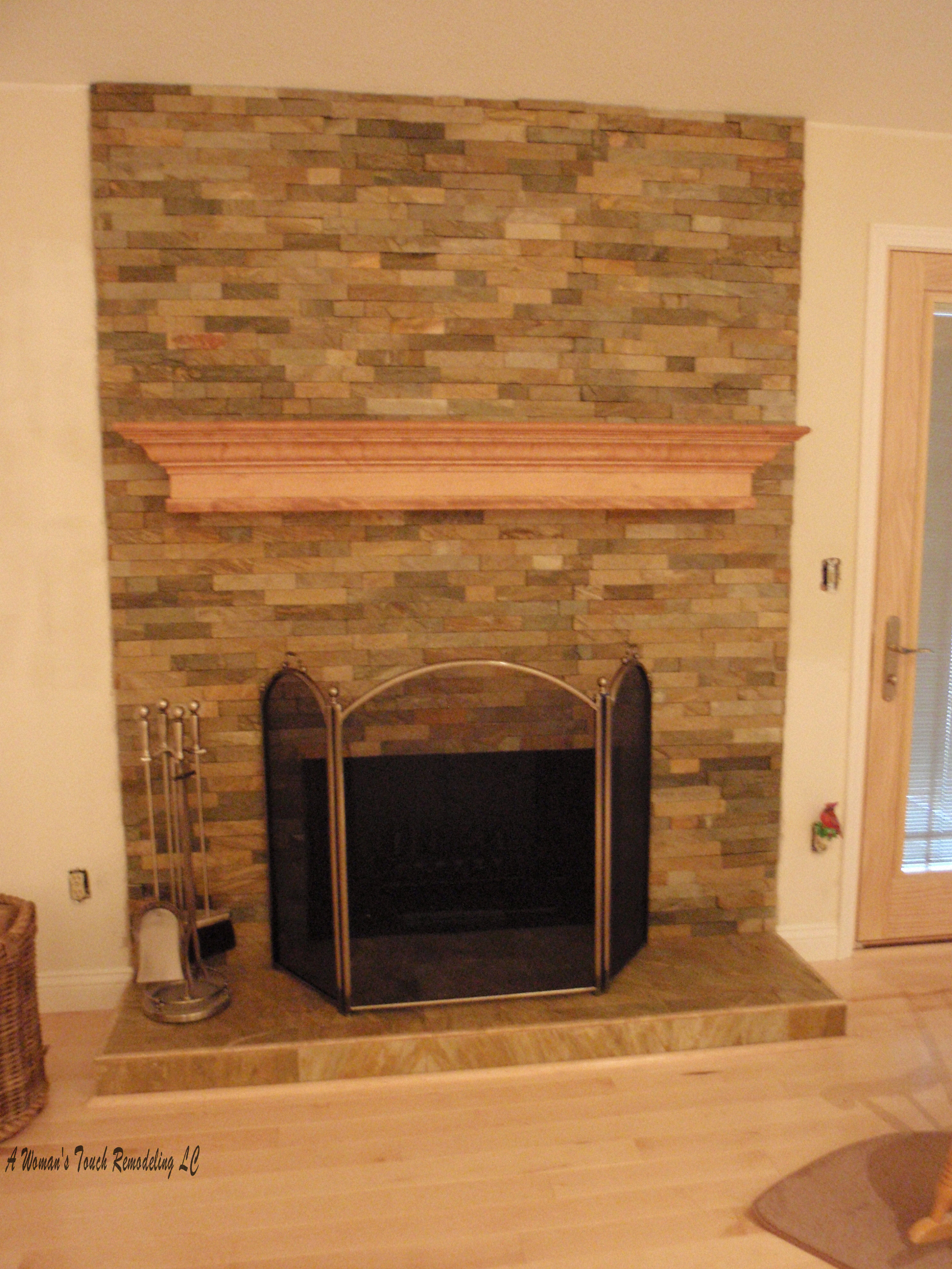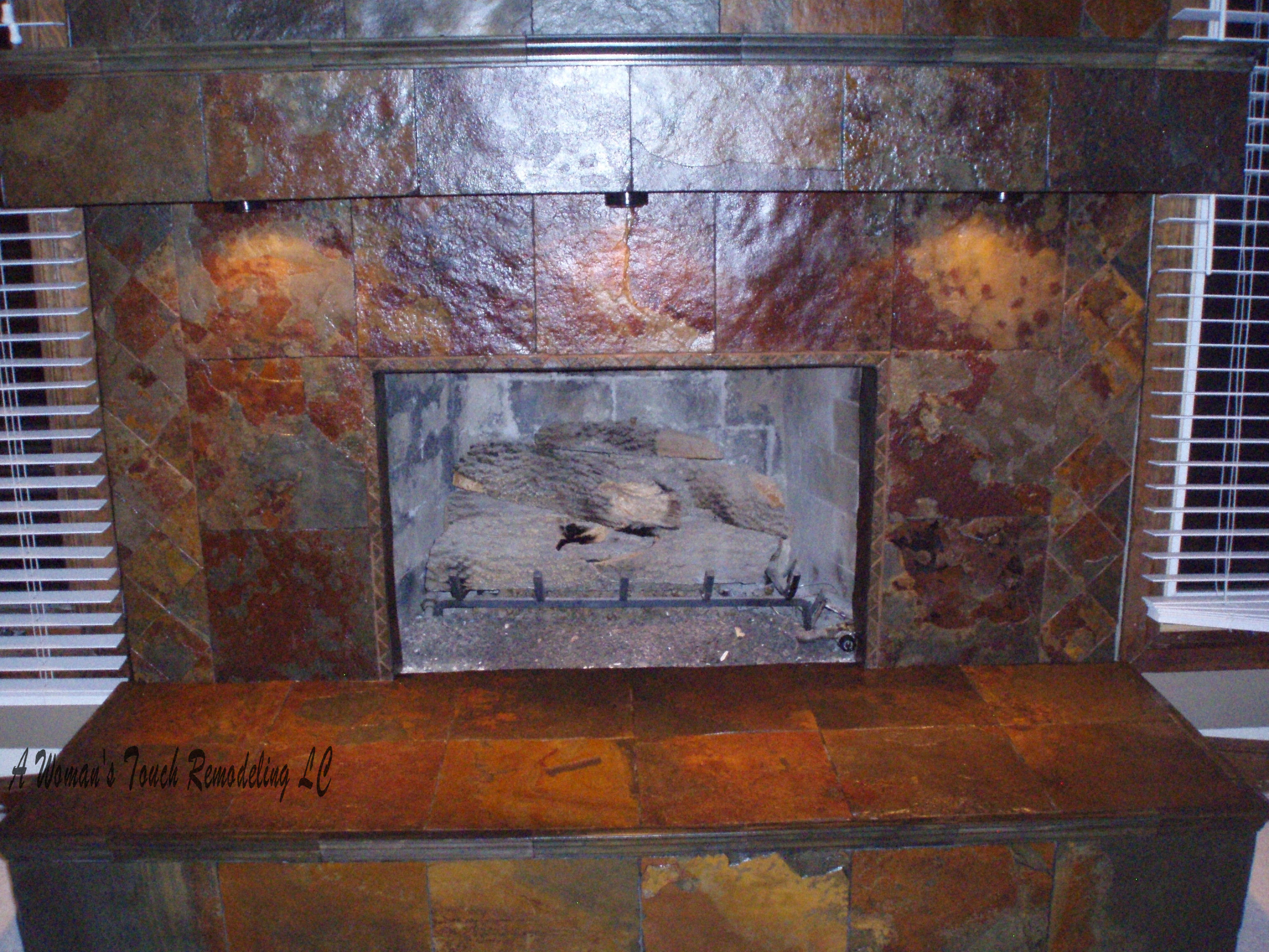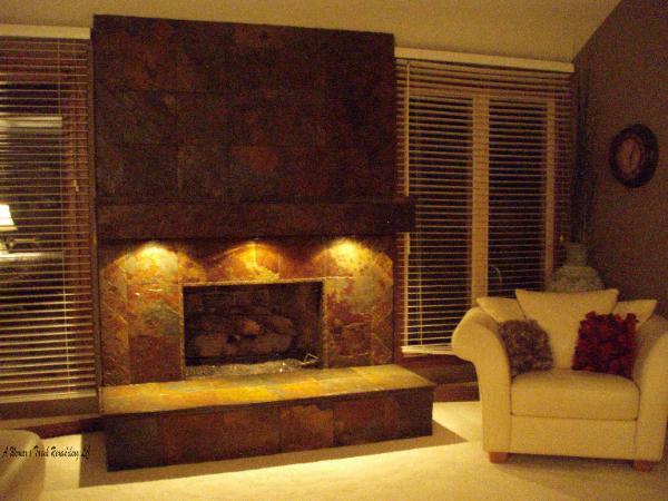 of the once outdated brick fireplace, using Slate to